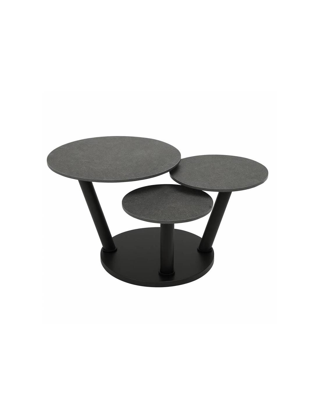 OSTEO is a dynamic and stylish coffee table designed for both functionality and visual impact. It features three round surfaces mounted at different heights on a central base, which can be rotated, extended, or neatly stacked depending on your needs. The dark glass-ceramic tops contrast elegantly with the black metal supports, while the sturdy base ensures stability even when fully extended. Its versatile design makes it suitable for both small and spacious living areas, offering flexible space for drinks, books, or décor. Perfect for modern, minimalist, or Scandinavian-style interiors.